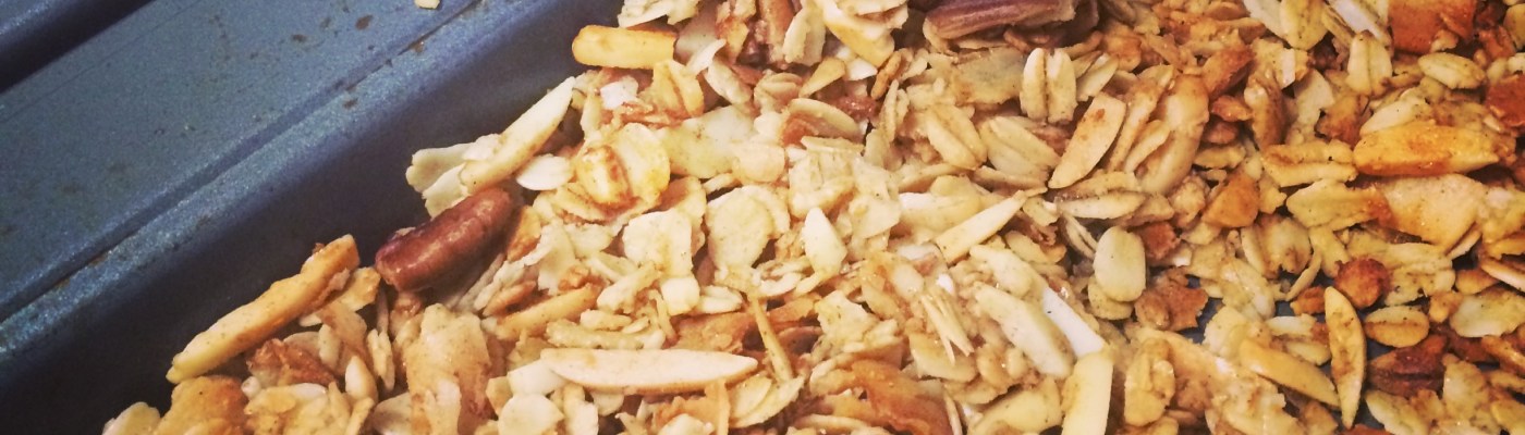 Pre-heat your oven to 300. Combine everything except the dried fruit in a large bowl and stir very thoroughly. Spread mixture onto two baking sheets* (parchment paper is very useful here, but if you don’t have it on hand the granola does contain enough oil that you should not need to grease the pans). Bake for 45 minutes to an hour, stirring every 20 minutes. Cool, add dried fruit if using, store in an airtight container.