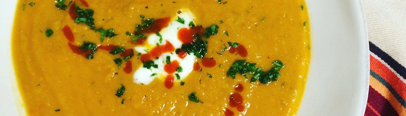 Return the pureed soup to the cooking pot. Bring back to a simmer over medium-high heat, about 10 minutes. Add water as needed to thin the soup to your preferred consistency. Taste, adjust heat as desired. Serve with yogurt and diced scallion for garnish, with a big splotch of sriracha for the real spice lovers.